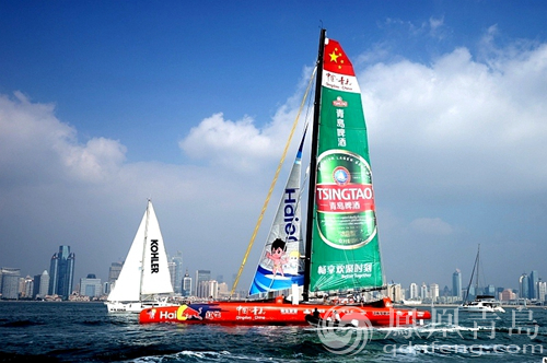 “中国•青岛”号启航现场(摄影:王祥胜) 启航仪式现场,青岛市政府赠送给“中国•青岛”号帆船鲜艳的五星红旗,希望“中国•青岛”号本次航行活动圆满顺利,并能将祖国的这份深情沿途传播。随后青岛市体育局局长、21世纪海上丝绸之路中国青岛号帆船航行组委会副主任兼秘书长纪高尚,国家体育总局水上运动管理中心副主任、国家体育总局青岛航海运动学校校长郭洪峰,青岛城投集团党委书记、青岛旅游集团董事长王红为“中国青岛”号国际船队赠送航行活动纪念衫,海尔集团、青岛啤酒作为本次航行活动的赞助商分别为“中国•青岛”号送上精心准备的礼物,祝愿本次航行一帆风顺! 本次航行,“中国•青岛”号帆船队将满载新梦想、新能量、新思路、新形象,秉承“和平合作、开放包容、互学互鉴、互利共赢”的丝绸之路精神,将青岛的城市形象、中国的国家形象,传递到海上丝绸之路沿途的国家和地区。 |