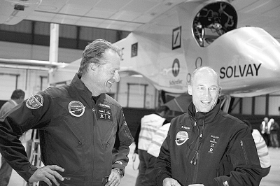 5月13日晚,在比利时首都布鲁塞尔国际机场,安德烈·勃希伯格(左)驾驶“太阳驱动”号太阳能飞机降落后与“太阳驱动”项目发起人、瑞士探险家贝特朗·皮卡尔交谈。当天,“太阳驱动”号太阳能飞机,用12小时59分飞行630公里,从瑞士帕耶那机场起飞,途经法国和卢森堡,抵达布鲁塞尔,成功完成首次跨国飞行。 |