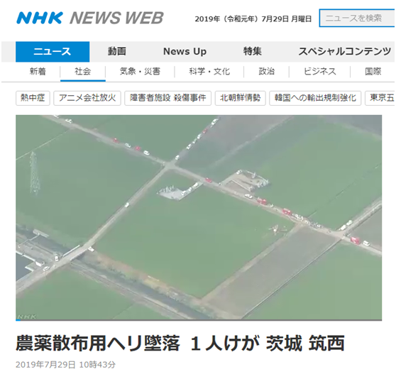 NHK报道截图 据日本广播协会(NHK)29日报道,29日上午8时30分左右,茨城县筑西市一架喷洒农药的直升机坠落进田地。事故发生后,该直升机的所属公司S.G.C.佐贺航空立刻向消防部门进行了通报。