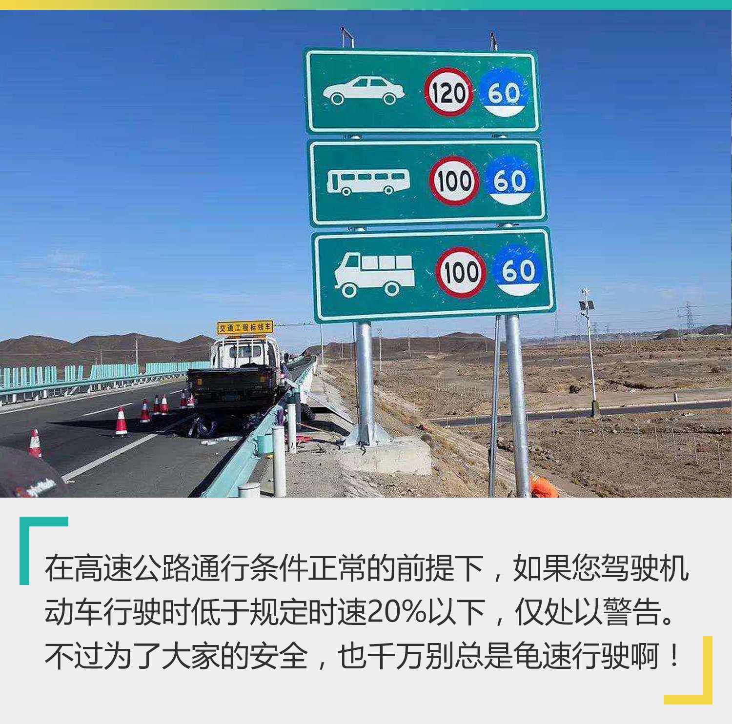 大家都很清楚,高速公路上除了限制最高行驶车速,同时也限制了最低行驶车速。抛开因交通事故、拥堵所造成的低速行驶不说,在高速公路通行条件正常的前提下,如果您驾驶机动车行驶时低于规定时速20%以下,也仅仅只是处以警告。举个例子,高速公路一般最低限速是80km/h,只要您车辆的行驶速度不低于64km/h,那么是不会被罚款和扣分的。