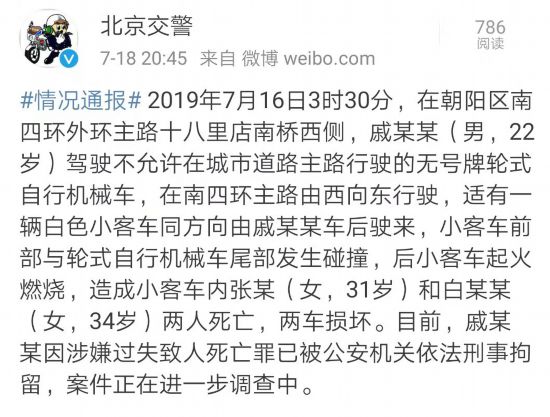 7月16日凌晨,南四环主路发生一起SUV和铲车追尾的交通事故,导致SUV内两人死亡。目击者提供的视频中显示,铲车司机在现场长时间拨打电话,未理会路人挪车救人的提醒,铲车司机的行为引发争议。 当天下午,“北京交警”官方微博通报称:7月16日3时许,南四环外环主路十八里店南桥西侧,一辆小型普通客车由西向东方向行驶时,与前方一辆轮式自行机械车辆尾部相接触后起火,事故造成小型普通客车内司机及乘客两人死亡,两车损坏。 据今日北京交警方面的最新通报,2019年7月16日3时30分,在朝阳区南四环外环主路十八里店南桥西侧,戚某某(男,22岁)驾驶不允许在城市道路主路行驶的无号牌轮式自行机械车,在南四环主路由西向东行驶,适有一辆白色小客车同方向由戚某某车后驶来,小客车前部与轮式自行机械车尾部发生碰撞,后小客车起火燃烧,造成小客车内张某(女,31岁)和白某某(女,34岁)两人死亡,两车损坏。目前,戚某某因涉嫌过失致人死亡罪已被公安机关依法刑事拘留,案件正在进一步调查中。 |