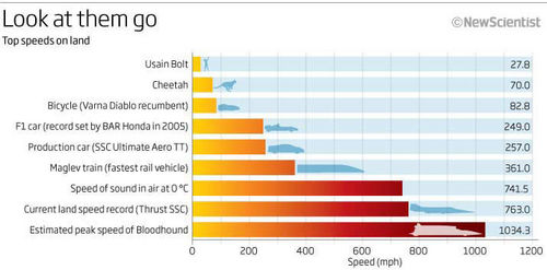 图:在269英里的时速下,猎犬号的加速度超过了全力推进的方程式1赛车。格林拉紧了安全带,然后按下了火箭开启按钮,刹那间,他被汽车2.3g的加速度摁在了座位上。 据《新科学家》报道,“怎样区别坐在飞机里和坐在汽车里体验超音速的感受?伙计,那很困难。”格林说道。格林说这些话不是凭空乱吹,他是地球上唯一一个能凭自己个人经验说这些话的人。格林曾经作为一个飞行员为英国皇家空军服役20年,而现在他的超音速汽车仍然可以保证他是世界上最快的人。早在1997年,格林就曾经驾驶一辆叫ThrustSSC的汽车,确立了763英里每小时的陆地行驶速度记录。格林也因此成为了世界上第一个迄今也是唯一一个驾驶轿车打破音障的人。现在,有了猎犬号超级汽车(Bloodhound SSC),格林又要进行他的极速之旅了。 只是这次格林的极速之旅不再孤单了。他有了两个竞争者,两队分别来自美国和澳大利亚的赛车队。赛车队的第一步打算是打破格林的记录,并达到每秒超过800英里的速度。如果第一步成功了,赛车队的下一步尝试就是1000英里(1609千米)每小时的速度了。“这就是我们设计猎犬号超级汽车的目的”, 猎犬计划首席航空工程师罗恩·阿耶斯说道。 参赛的三辆赛车都有车轮,刹车以及方向盘。这是传统汽车都有的。然而,音速或者超音速带来的挑战是传统汽车从没遇到过的。要想达到或超过音速,汽车就必须要有大胆新颖的设计以及动力系统。 比方说,汽车时速要想达到1000英里,汽车轮胎的转速必须要超过1万转每分。这个转速比普通轿车的转速快了很多倍。这个转速意味着5万g左右的加速度,5万g加速度产生的力可以很轻而易举的就把普通轮胎撕碎。鉴于此,比赛用赛车的轮胎都是用坚固的钛材料制成的,确切的说是碳化加固型钛材料。需要注意的另外一个问题是,当汽车的速度接近音速时,一种正面冲击波会产生,并使前方的地面泥土液化。这样一来,轮胎就不是在地面行驶,而是陷进地面去了。还有更重要的问题,时速超过250英里的时候,气流的影响不容小觑。汽车在这个速度行驶的时候,轮胎的功用更像是船舵或者是机翼。而驾驶汽车更像是驾驶极速运行的船只或是驾驶飞机。对此,格林表示:“我们最大的问题就是如何控制轮胎在地面上的运行。”