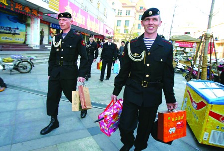 左一个大包右一个小包,俄罗斯水兵趁着空闲在岛城忙着开心购物。胡希平 摄