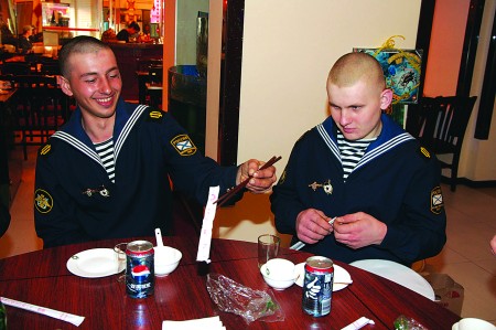 几名俄罗斯水兵来到中山路上一家餐馆吃饭,一名水兵学着使用起中国筷子。据老板讲,这两天已经有 50余名穿着制服的水兵来到他们餐馆。因为语言不通,他们只能通过图片点菜。
