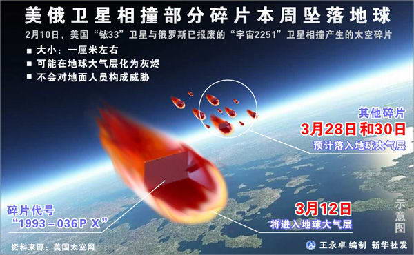 资料图片:2009年2月10日11时55分,美国铱卫星公司的“铱33”商用通信卫星与俄罗斯已报废的“宇宙2251”军用通信卫星相。新华网发