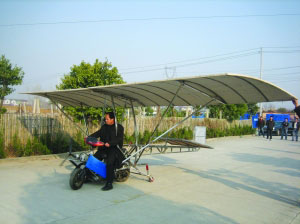一个普通的退休工人造出一架“山寨飞机”,这事是真的。南京市浦口区盘城街道56岁的退休工人章德东用106天,在自家摩托车的基础上,制造出一架“飞机”。昨天章德东在一条宽敞的马路上进行了试飞,虽然记者没有看到飞机升空,但章德东信心满满:“前几天试飞还飞了七八米高呢,我还会继续试飞并进一步改进。”