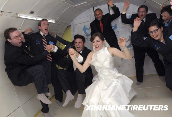 6月20日,来自美国纽约的诺厄·富勒莫和埃琳·芬尼根在一架特制的波音727型飞机上举行的“零重力”婚礼上接吻。当天,这对新人搭乘这架飞机从位于佛罗里达州卡纳维拉尔角的肯尼迪航天中心出发,成为世界上首对在零重力状态下举行婚礼的夫妇。新华社/路透 |