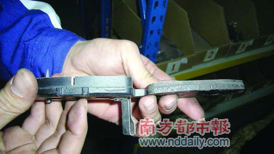 2、与新刹车片(左)相比,磨损严重的刹车片明显薄很多(右)。