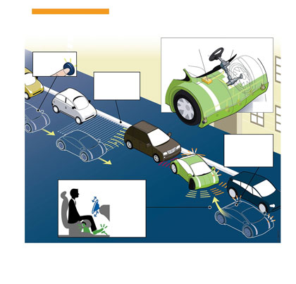 这种基于超声波技术的驾驶辅助系统可以在15 s内自动将车指引至停车位。当汽车以30km/h的最大速度行驶时,该系统可以根据汽车的长度对街道两旁进行扫描以寻找合适的停车位。一旦确定停车位,驾驶员就可以停止驾驶并把车置于倒车状态,从而激活自动指引系统。在前后方超声波停车辅助传感器(UPA)的协助下,进行自动停车,当然停车的速度还是由驾驶员来控制的,同时如果想中途停止,只需制动或者是打转向盘。下图是这个系统的工作及原理示意图。