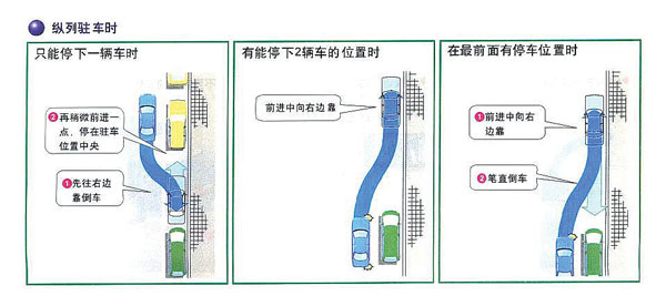 其实在纵列停车时,从行驶状态到最终将车辆停到路边,不仅有章可循,甚至还有轨迹可循。在2006年6月号的“安全驾驶”栏目中,我们系统地介绍了场地停车的方式以及轨迹,本期如法炮制,继续把纵列停车的图示以及方法介绍给大家。一般纵列停车可以分为两种形式:一种为前后都有车的纵列停车,另一种则是只单向有车的形式。如左图所示,在只能停下一辆车时,用倒车的方式向路边靠近,并安照图中的轨迹将车停入车位;如果有足够大的位置,按照图示相对也比较容易一些。