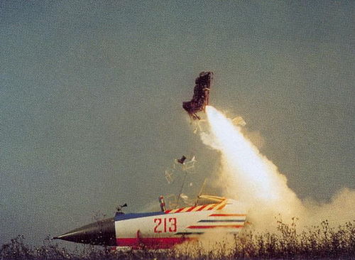 当年实验中的歼10配套的HTY-5型弹射座椅弹射瞬间
