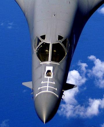 B-1A由于需求改变下马后,采用低空高亚音速突防的B-1B改回了普通的弹射座椅逃生,注意驾驶舱天窗后面左右各二,一共四个的方框,那些就是弹射时打开的紧急逃生舱门