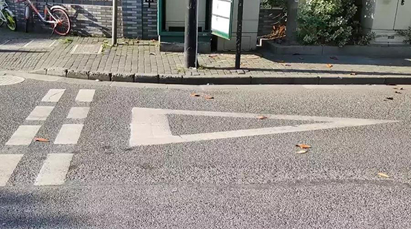 4、倒三角路口减速标线 倒三角路口减速标线,用来提醒驾驶员,前方是路口,必须减速慢行,会车时要让主干道的车辆先行。
