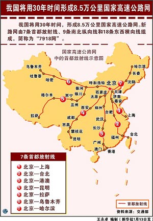 “十一五”的五年里,我国加速编织立体交通网,我国公路、水路、民航、邮政均迎来历史上最大规模的建设热潮,取得前所未有的大发展,陆海空条条大道畅通,基本满足了百姓出行需求。 在陆上,到2010年年底,全国公路网总里程达到395万公里,5年新增60.5万公里;其中,高速公路通车总里程达到7.3万公里,五年新增3.2万公里,国家高速公路网骨架基本形成。 全国农村公路通车里程到去年年底达到345万公里,五年新增通车里程53.5万公里。其中,东、中部地区94%的建制村通了沥青(水泥)路,西部98%的建制村通了公路。广大农民在家门口就有路走,有车坐,“村村通”成为广大百姓最欢迎的“德政工程”。 全国邮路总长度达到380万公里,五年新增40万公里。邮政行业业务总量完成1975亿元,同比增长21%。 在水上,我国内河水运建设五年总投资为1000亿元,超过新中国成立至“十五”末的投资总额;全国沿海港口通过能力达55.1亿吨,五年新增30亿吨;内河航道里程达12.3万公里,五年新增及改善航道里程5700公里。五年救助遇险人员97367人,平均一年救助超过19000人,救助成功率达到96.3%。全国共设置了20个直属海事机构,112个分支机构,承担起水上安全监管工作;国家五年对救捞共投入55亿元,救捞系统拥有各类救助船舶70多艘、120艘打捞船舶和21架救助飞机,海上有人遇险,救捞队伍快速出动救人。 在空中,中国民航业“十一五”期间航空业务规模快速增长,成为全球第二大航空运输系统。统计数据显示,到去年底,中国民航运输机队总量达到1610架,是2005年的1.87倍;通用航空作业年均增长10%;通用机队数量翻番,达到1000架。去年民航全行业完成运输总周转量505亿吨公里,旅客运输量达到2.7亿人次,货邮运输量达到520万吨,年均增长分别为14.1%、14%和11.1%;航空运输旅客周转量在综合交通体系中的比重提升了3个百分点。统计数据显示,2010年全国公路客货运量完成300亿人次和220亿吨,分别是2005年的1.8倍和1.6倍;港口和集装箱吞吐量连续7年保持世界第一;内河货运量完成17亿吨,是2005年的1.6倍;民航客货运量完成2.66亿人次和500万吨,分别是2005年的1.9倍和1.6倍。 在“十二五”期间,将按照适度超前的原则,继续加强交通运输基础设施建设,大力推进综合交通运输体系建设,统筹规划衔接,合理配置资源,逐步实现各种运输方式“无缝衔接”,到2015年,初步建成便捷、高效、绿色、安全的交通运输体系。 “十二五”期间主要建设内容:以国家高速公路网建设为龙头,加强省际连接线即“断头路”建设。修订国家公路网规划,强化国省道改造,力争“十二五”末路网整体结构优化升级,服务水平进一步提高;有序推进沿海港口建设,完善煤油矿箱等主要货种港口布局,加强资源整合,推进以临港工业为依托的沿海港口新港区开发建设。加快推进长江等内河高等级航道建设,实施南京以下12.5米深水航道建设工程、荆江河段治理工程、西江航运干线和京杭运河扩能工程等重点项目;优化机场布局,增强机场保障能力;加强邮政基础网络建设和增强快递发展能力,基本完成空白乡镇邮政所补建。 公路 【国家高速公路网】 《国家高速公路网规划》(全文) 于2004年经国务院审议通过,这是中国历史上第一个“终极”的高速公路骨架布局,同时也是中国公路网中最高层次的公路通道。 《国家高速公路网规划》采用放射线与纵横网格相结合的布局方案,形成由中心城市向外放射以及横贯东西、纵贯南北的大通道,由7条首都放射线、9条南北纵向线和18条东西横向线组成,简称为“7918网”,总规模约8.5万公里,其中:主线6.8万公里,地区环线、联络线等其他路线约1.7万公里。 首都放射线7条:北京-上海、北京-台北、北京-港澳、北京-昆明、北京-拉萨、北京-乌鲁木齐、北京-哈尔滨。 南北纵向线9条:鹤岗-大连、沈阳-海口、长春-深圳、济南-广州、大庆-广州、二连浩特-广州、包头-茂名、兰州-海口、重庆-昆明。 东西横向线18条:绥芬河-满洲里、珲春-乌兰浩特、丹东-锡林浩特、荣成-乌海、青岛-银川、青岛-兰州、连云港-霍尔果斯、南京-洛阳、上海-西安、上海-成都、上海-重庆、杭州-瑞丽、上海-昆明、福州-银川、泉州-南宁、厦门-成都、汕头-昆明、广州-昆明。 此外,规划方案还包括:辽中环线、成渝环线、海南环线、珠三角环线、杭州湾环线共5条地区性环线,2段并行线和30余段联络线。 要实现这个规划目标,预计需要30年的时间。2011年1月18日,交通运输部副部长翁孟勇当天在国新办新闻发布会上介绍,“十一五”期间我国高速公路通车里程达到7.4万公里,新增3.3万公里,居世界第二位。“十二五”期间,交通运输部将以国家高速公路网建设为龙头,加强省际连接线建设,由7条首都放射线、9条南北纵向线、18条东西横向线组成的国家高速公路网将于2015年基本建成。 |