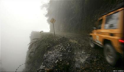 玻利维亚 北永加斯山路 位置:在拉巴斯和歌罗伊歌镇之间 惊险度:地球上最危险的路,也被称为“死亡之路” 。贯通40英里山路,最窄的地方只有10英尺,1000英尺的路是垂直冲入下面的热带雨林,而且还没有护栏。