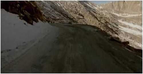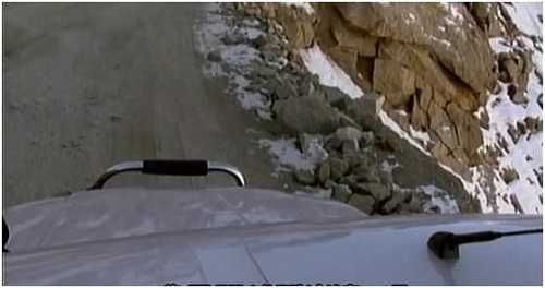 当到达海拔4900米的时候,不仅人开始受到高海拔的影响。连车子也一样。动力大幅衰减。需要大力踩油门,车子才能前进。渐渐看到了山顶上的积雪。最后当到达山顶时,记住用当地话大喊三声“众神胜利”。 山顶有军队驻扎。对于驻扎当地的士兵来说,天气很热——零下18度。空气中的含氧量只是平地上的一半。马许在山顶医疗站作了检查,血氧饱合度只有74%——低于80%就有危险。对于高山症的患者,唯一有效的办法就是下山。由于军方封锁了下山的路,马许只能在医疗站吸氧。 下山的道路在山的另一面,由于路段背阴,路上都有积雪。所有车辆都在山顶装好雪链之后再下山。很长路段的地面是硬冰,只能打一档,车速控制在8公里左右,轮子不住的打滑,但不能踩刹车。每年这里的路上都会有4-8尺的积雪,而道路上方随时会发生雪崩。雪崩曾把铲雪的推土机推下悬崖,并造成两人死亡。