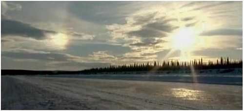 开车时,你会看见路边的冰里“长”出许多船来。这些都是在冰冻之前开进内河的船,它们夏季在北极工作,冬季就这样被冻在河里。 在冰河上开车,即使在太阳当头的时候,能见度也不高。你会发现,前车排出的废气似乎停留在空中。废气排出后短短几秒钟内,从120多度降至零下40度。废气中的水蒸汽马上变成悬浮在空中的小冰粒。造成冰雾。