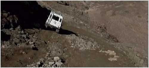 在通过一个之字形弯时,马许感觉SUV有某个部件断了,因为下坡时他听到砰的一声巨响。在下车查看后,看到后轮半轴断了。半轴替后轮提供驱动力,在半轴断掉之后,只剩前轮驱动了。 只有前轮驱动的车辆爬坡会变得异常艰难。原本轻松可上的坡,现在却十分吃力。只有当半轴断掉之后,才会非常、非常深切的理解为何法律规定只有四驱车可以进入此路。