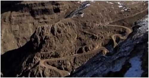 路程:从印度列城出发穿越喜马拉雅山,在海拔5602米通过卡东隘口——这是全程最难的路段。终点是与世隔绝的迪斯基特镇——在那附近,印度与巴基斯坦正在争夺当地的掌控权,也是世界上空气最稀薄的战地之一。全长118公里。 概况:全球海拔最高的公路。整条狭窄的道路都紧帖着悬崖,路面宽度不到三米。还经常碰到大卡车。 危险: 1.悬崖是头号杀手,一路上你可以不断的看到车子的残骸。在这里会车是很恐怖的事情,但军方卡车在转弯时是高速通过的(比你的速度高三倍)。 2.冰雪和雪崩,在严冬,大雪可能会造成路面积雪8公尺。卡东隘口经常爆发雪崩,每年都有人在这里死亡。