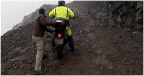 在爬坡的路上,马许看到一个摩托车骑手正在努力爬坡,名称叫艾伦,有些本地人来此只是为了验证自己的越野技术。但这位车手遇到雪,路面湿滑,无法开上坡去。