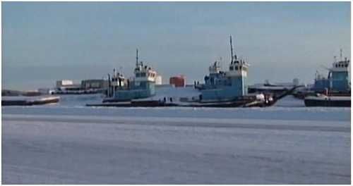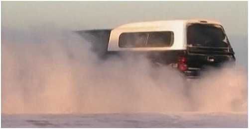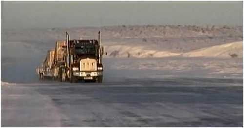 在冰河上行驶的卡车都非常巨大,因为要拖很多的货物。当这些卡车经过的时候,你会听到卡嚓卡嚓的冰的碎裂声。两部大卡车之间必须至少间隔400公尺的距离,防止把冰压跨。虽然卡车一直不停的在运送物品,但这些长途运输的物品很贵。靠海维生仍然占原住民家庭的70%。 当开到永冻层的时候,你会看见植物没法在这么寒冷的地方生存,因此道路两边的树丛消失了,白茫茫一片。在这白茫茫的一片中,唯一可以在视觉上作为点缀的就是小冰丘。小冰丘对当地人非常重要,他们把它当作远望点,并用来判断方向。因为在这茫茫一片中,没有别的东西可以用来当作参照物。