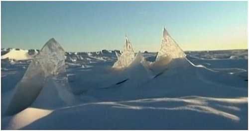 如果要更近距离的接触永冻层,那就到当地人的地下冰库去。在挖出来的地下室中,能够看到冻得硬梆梆的泥土,像石头一样硬。他们在地下室里冷藏食品——鱼,鲸肉和驯鹿。 傍晚时分,最危险的路段到了。这一段路是冰冻的波福海——车辆已经从冰河开到了冻结的海上。最后30公里是非常难以预测的路况,因为海水不像淡水那样容易结冻,所以波福海很容易破裂。在路上开过去时,经常看到潮汐造成的巨大裂缝。波浪、潮汐和风还会造成一些锯齿形的冰块,像刀一样伸出地面,叫压力脊。高度从1到4.5公尺不等。千万不能撞上它们。