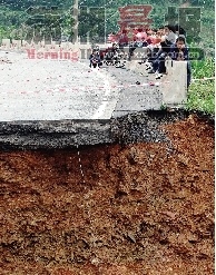 在永连公路24k+760米处记者看到,此处路段已被山洪冲成两段,形成一条深10多米的深沟,站在公路上,犹如站在悬崖峭壁上一般。据现场公路局的工作人员介绍,此处原是一个涵洞,山水从涵洞中经过,昨天山洪太猛,将道路冲垮了近20米长。现在,永连公路10公里的路段内已有4处出现大面积塌方,道路完全中断,里面20多辆客车被困,此外还有一些货车及小车。