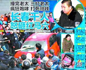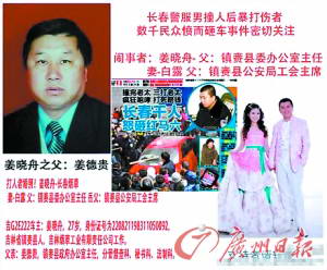 一男子驾车撞人之后还打人 口出狂言引发众怒 “我有的是钱,我打死你们,我把钱给你们……” 上周日,一名男子身着警服,驾驶马自达轿车在长春闹市区撞人后又打人,引起上千人围观,愤怒的群众将肇事者和他的妻子困在车中三小时后,赶来的警察才将车内的两人带走。这一事件被现场目击者拍成视频后上传到网上,一时间“警服男”、“马六男”成了网络热词,甚嚣尘上。 后经警方调查,这名男青年叫姜晓舟,27岁,吉林省镇赉县人,虽然他身穿警服,但并不是警察,有网友“人肉”后表示,姜晓舟是富二代。 车祸现场 千人怒砸肇事车 12月5日下午2时,长春市繁华路段的一座大型商场旁,上千余名长春市民将一辆红色的马自达轿车围得水泄不通,并大喊着:“别让他跑了!” 当天下午,一名穿着警察多功能服的男子驾驶一辆车牌为吉G2E222轿车,先是撞倒56岁的退休女医生高莉杰,接着又与在车上的妻子“联手”,对高莉杰和她女儿大打出手,这位男子边打边口出狂言:“我有的是钱,我打死你们,我把钱给你们……” 打人男子嚣张的气焰很快引起了公愤,不少在场人士围了上来要与打人男子“理论”,男子和他妻子见状不妙,立刻躲进车里。于是,在场众人一边愤怒地打砸汽车,一边要求已经躲进车里的男子出来道歉,甚至有一名围观者“出离愤怒”,专门买了一箱矿泉水,从2楼扔下砸车。 在车内被千人围困了近3个小时后,肇事司机和妻子被民警带走调查。而停在现场的肇事轿车却成了现场群众的“出气筒”,众人冲过警戒线,把这辆马自达轿车砸得坑坑洼洼,面目全非。 经警方调查,这位肇事男青年名叫姜晓舟,27岁,是吉林省镇赉县人,无固定职业。虽然他身穿警服但并不是警察。据了解,姜晓舟已因此被公安机关拘留15日,处罚款500元。 网友“人肉” 夫妻或为“官二代” 事件发生后,愤怒的网友自发对肇事者及其妻子进行了“人肉搜索”,搜索结果显示,夫妻两人都是镇赉县当地的干部,网友还张贴了相关人士的联系电话。 “姜晓舟,27岁,吉林省镇赉县人,在烟草有限公司工作;晓舟父亲是镇赉县委办公室主任姜德贵,主持县政府办公室全面工作,分管督查科、秘书科、法制科;妻子名叫白露,长春52中英语教师;晓舟的岳父是镇赉县××局工会主席,人称白老四。都是"高官"之后,怪不得这么牛呢,"官二代"。” 昨天下午,记者按图索骥,先后拨打了镇赉县办公室、长春市52中学校办以及网友提供的电话,求证这对夫妻的身份,但极为“巧合”的是,这几个电话均处于无人接听和占线中。而人人网上有关姜晓舟及其好友的资料也已经被删除。 据当地一位知情人王女士介绍,姜晓舟和妻子确是镇赉县人,当日夫妇前往长春购物,姜的家庭在当地的确比较好,用其初中同学的话说,他在学校就非常游手好闲,专横跋扈。但因为姜晓舟被拘留,他们的具体身份,目前尚无法求证。 伤者家属 对方家属已道歉 事件发生后,被打的高莉杰被送到附近的医院。她手臂和手腕上有好几处淤青,头上还有五六个大包。 据当地记者介绍,高莉杰是一名医生,她退休后接受了一家私人医院的返聘,月薪在万元以上。被打事件不仅让接受过高等教育的高莉杰觉得难堪,也影响了她的工作。目前高的家属正与打人者就经济赔偿数额进行谈判,如果赔偿数额最终谈不拢,高的一家将会考虑通过法律手段维护自己的利益。 昨天下午,有网友发帖声称:“在省医院神经外科病房,我看到昨天打人的"马六男"姜晓舟的媳妇了,一开始我也不认识,周围的人说,她就是昨天那女的,这才知道,病房里是昨天被打的妇女。姜晓舟媳妇是来道歉的。主要的意思就是挺后悔的,让被打的妇女好好看病,医疗费他们出。” 而高莉杰的老伴在接受记者电话采访时也证实了索赔和道歉的事,并表示姜晓舟的舅舅也一起到医院向他们赔礼道歉,态度非常好。目前包括误工费、医药费赔偿正在商谈中,但数额不方便透露。 网友PK 肇事轿车该不该砸? 面对这样的情景,我们普通人是应该选择围观,还是大家义愤填膺地主动伸张“正义”?长春本地一家论坛对“警服男事件”进行了一次网络热点辩论,其中有153名支持直接砸轿车,而有16名网友表示虽然有错,但不应该砸车,应用法律去惩治他。 网友沈浪表示:“这是一次胜利的砸,团结的砸,鼓舞民心的砸。可以说,我们爷们砸的,不是马六,是没有人性的嚣张、是"装13者"的特权。” 反方网友则认为:“不赞成武松式的正义,不赞成砸车!” 也有网友保持中立态度,网友“噼里啪啦”说:“我保持中立,砸他,我陷入如"警服男"不文明的野蛮。不砸他,难解我心头之恨。我旁观,用眼神杀死他,我等待,用法律惩治他,我期待,用谴责折磨他……” 专家点评 “官二代”缘自权力固化 “呜呼,省治乃首善之区,其民风淳朴,治下之民与舟又无隙也,然一区区小事终至其局面不可收拾,何也?乃世风日下,达者为富不仁;势者赏罚倒置,民有激愤而无地宣泄,又有好事之徒,从中调唆,终至事发。”网友原创的史记体传记《异史记·姜晓舟传》再次表明,现今,部分“得志便猖狂”的“官二代”正越来越刺激公众敏感的神经。 广州市社科院研究员彭澎在接受记者采访时表示,最初的“富二代”出现,显示的仅仅是群体性的仇富心理,而“官二代”显示出来的问题更加严重。不少“官二代”自恃父辈有权力,就高人一等,无视法律的规定,叫嚣“我爸