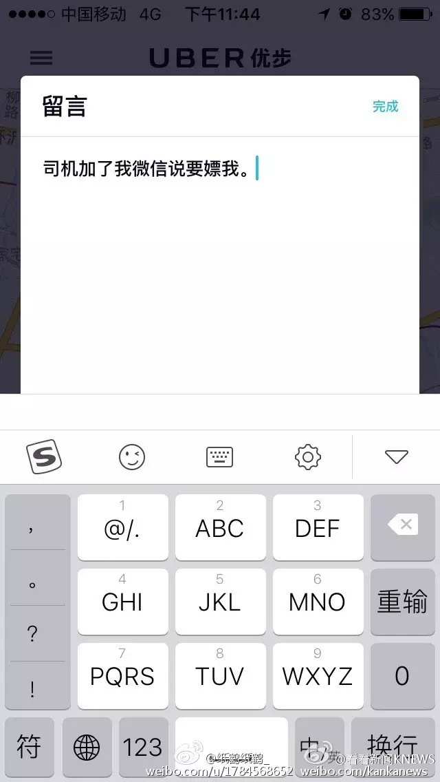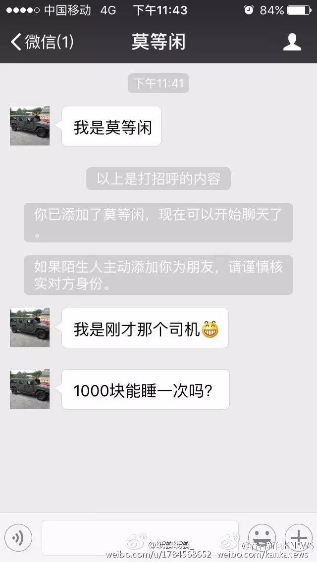 Uber司机精虫上脑 1000元欲嫖乘客!】据网友爆料,一位上海女生在深夜用优步叫了一辆车。下车后,刚才接单的司机居然主动加她微信,问她“1000块能睡一次吗?”随后,她立刻向优步平台进行了投诉,并得到了回复称:将该车主的账号永久封禁。