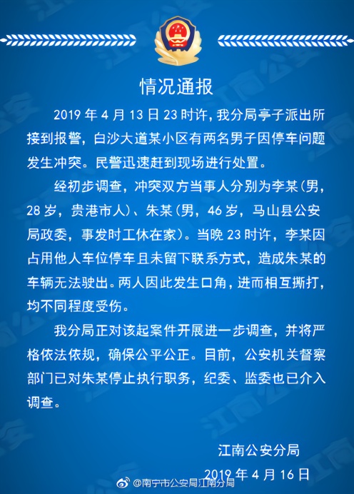 经初步调查,冲突双方当事人分别为李某(男28岁,贵港市人)、朱某(男,46岁,马山县公安局政委,事发时公休在家)。当晚23时许,李某因占用他人车位停车且未留下联系方式,造成朱某的车辆无法驶出。两人因此发生口角,进而互相厮打,均不同程度受伤。 江南分局正对该起案件开展进一步调查,并将严格依法依规,确保公平公正。目前,公安机关督察部门已对朱某停止执行职务,纪委、监委也已介入调查。 早前报道 “公安局长”打人?南宁一男子反映因占用车位被暴打,打人者:我是局长,请大家评理 4月13日晚上11点左右,家住南宁市景江园小区的农先生(化名)突然接到父亲生病的消息,心急的他打算连夜开车赶回贵港老家。农先生开车回到小区,把车停在一个空闲的车位后上楼拿行李。然而10多分钟后,当农先生下楼准备开车出发时,却发生一件让他很气愤的事:被一个自称公安局长的人打了。 当时究竟发生了什么?农先生说,当时他回到停车场,看到保安和一名中年男子站在他的车旁。农先生立即意识到自己占了别人的车位,堵住了停在前面的路虎车。
