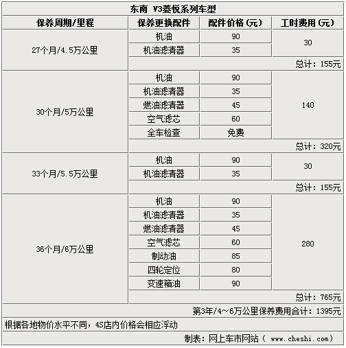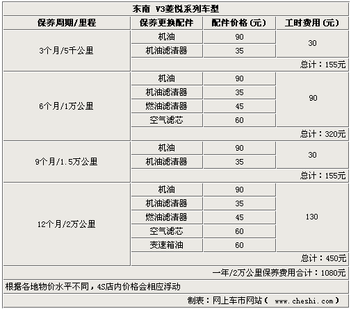 东南V3菱悦系列车型已成为众多家庭首选车型之一,加上刚刚上市的V3菱悦风采版目前共有4款车型。其凭借时尚的外形以及在同级车中优秀的动力及操控表现,逐渐被年轻消费者所喜爱。对于准备购买和已购买V3菱悦系列的消费者来说,它们的保养费用和周期都是多少?是否在您的经济承受范围之内呢?下面我们就来看看在行驶3年时间达到6万公里的过程中V3菱悦系列所需要的保养费用是多少。