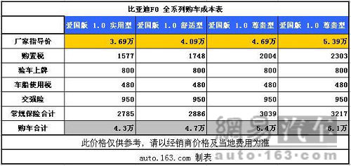 网易汽车报道 比亚迪FO炫酷的造型吸收并整合了众多国际流行元素。比亚迪F0秉承“风格JUSTCOOL时尚0缺憾”的设计理念,正面与丰田的AYGO颇有几分相似,大眼设计借鉴了奔驰SMART的灵感,尾部设计借鉴了雪铁龙C1的样式。比亚迪F0活力动感,非常惹人喜爱,成为很多年轻人第一辆车。究竟购买比亚迪F0和日后使用的费用是多少呢?下面我们就为大家进行分析。 一、购车成本,实用型4万余元开回家 购车费用常用公式:购车费用公式=裸车价(厂商指导价)+购置税+上牌费+商业保险+交强险+车船使用税 购置附加税:购车款/23.4(1.6升及以下);购车款/11.7(1.6升以上)1.6升以下排量的车型,购置税会得到减半的优惠政策。 验车上牌:此价格仅供参考,具体价格以各地验车上牌价格为准。 车船使用税:各省不统一,北京9座以下客车为480元/年,9座以上客车540元/年。 贷款买车的具体月供额,可到当地的4S店查询。 二、保养和维修价格属于中等水平,平均每年800余元 厂家给比亚迪F0提供的是3年10万公里的保修期限,相比于其他品牌的保修时限这一点值得肯定,令用户的需求得到了充分满足。车辆首保里程建议在3个月或3000公里做,首保免费。第二次保养是在车辆行驶8000公里或者半年的时候进行,第二次保养主要是进行更换机油机滤,并进行相关零件的检查以及油液的补充费用在130左右。车主以后每次保养的时间是在车辆每行驶5000公里后进行,每次保养的里程和保养项目的费用参见下表: 配件价格表: 比亚迪F0各个车型的保养费用相同,基本上6万公里内消费者在保养车辆上的花费为2635元。以上信息从北京地区的4S店获悉。其他地区的比亚迪4S店可能因为工时费用上的不同而造成保养价格上的差异。 三、油耗费用小车省油综合油耗5.2L/100km 根据国家工信部公布的《乘用车燃料消耗量》中比亚迪F0的综合工况油耗数据是:郊区4.91L/100km,城市6.19L/100km,综合5.2L/100km。区别于厂家公布的等速油耗,《乘用车燃料消耗量》是国家工信部以官方的形式客观对市场销售车型通过标准化实验所得来的数据,具有一定得权威性。但是,因为个人驾驶习惯和驾驶环境的问题,在实际使用过程中还会有出入。以北京地区93号汽油6.19元/升,一年行驶2万公里计算,可以得到燃油费为: 过路费、临时停车费等:以1200元计。上述各项使用成本相加1年2万公里使用成本约为12799元,平均每月为1066元,而且随着F0保有量的不断提高,保养费用将会不断的降低。 综合以上费用,比亚迪F0一年用车成本为:燃油费+车险+车船使用税+保养费+意外支出=6437.6+3900+480+782+1200=12799.6元。平均每月约1066元。 |