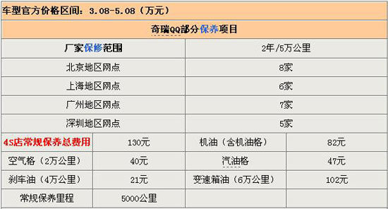 刚刚踏进09年,最高售价超过200万的全新宝马已经登陆中国,富豪们一阵狂喜,纷纷为这一宝马又一巅峰之作慷慨解囊。但是当今国内能有足够的前买这样的好车毕竟是少数,作为平民百姓,偶尔欣赏一下已经满足。而一些售价仅仅4万元的小车,不但价格实惠,而且也能满足国内众多消费者对于汽车的狂热。买车容易,养车难似乎已经成为了国内车主一个共鸣。车主在资金有压力的情况下,动则接近10万元的车型无疑是没有太大的必要,但如果只是4万元左右的车型,仅仅耗费跟朋友外出吃饭的钱,就能同样能带给你驾驶的乐趣呢?下面,就让编者带你看看国内4万元级别车型的养护费用,让你在买车以后,同样不会受昂贵的养车费用而影响有质量的生活。 奇瑞QQ
