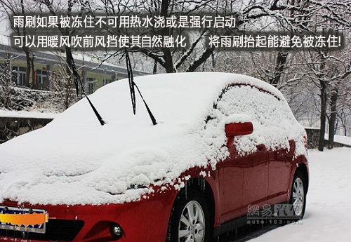 如果发现雨刷被冻住,不要用热水直接冲洗,这样容易使车窗因为温度变化而炸裂、雨刮器变形;更不能强行启动,以免损坏发电机。