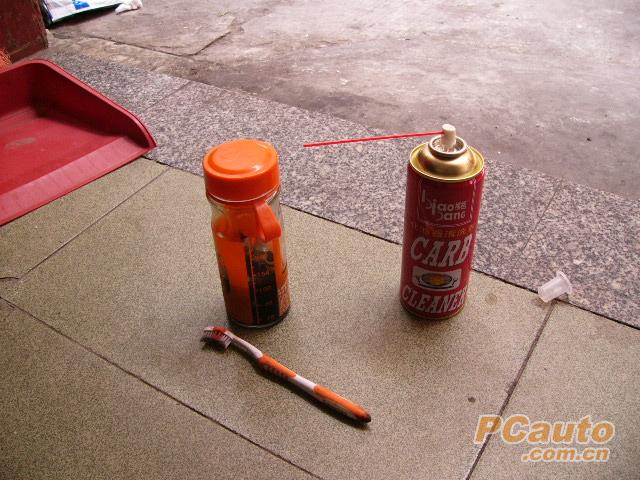 准备工具,火嘴套桶.化油器清洗液(大把有卖)玻璃瓶,旧牙刷(先用清洗液泡泡看,有些牙刷会溶的就不能用.