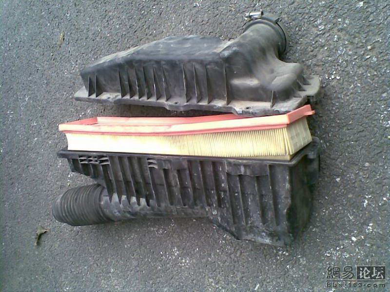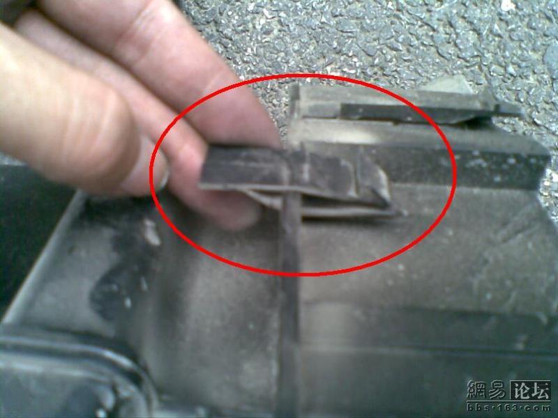 按住集气箱右侧的这个卡扣,将集气箱向上拔,就可以连带空滤一起拆下来了。当然,这里还是需要一点勇气和力气的,别舍不得自己的爱车,看准了该用力还得用力,又不是细皮嫩肉的小MM~~~不过,在提起集气箱之前一定要记得右边的那个卡扣,不要太用力按,否则。。。。。。就会像我一样,咔嚓一下按断了。。。。。。