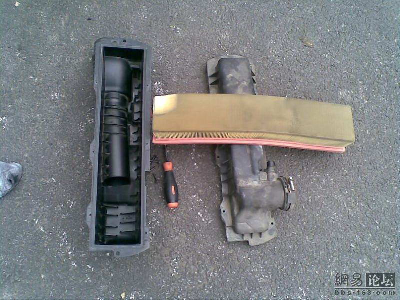 转过头来,用螺丝刀把空滤的外壳打开,拿出空滤的滤芯,到旁边拍拍打打吹吹甩甩,差不多可以了,再装会到空滤壳子里面,拧好螺丝,准备安装。