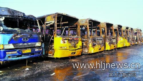 违章操作引火灾 哈尔滨9公交车"串烧"成空壳(图)