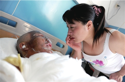 中午12点,伤者的家属陆陆续续来到医院。一名姓胡的女子冲进病房后寻找她的男友张德志,张德志全身都包裹着厚厚的纱布躺在床上,看到胡女士后他的眼泪划过已经肿胀的脸颊。胡女士开始并没有认出他,直到看到了床头的名字才相信。张德志说不出话,他将包满纱布的左手抬了抬。胡女士走到床边,全身都在发抖,他们相互对望了几分钟后,胡女士突然俯下身,在张德志耳边轻轻说:“我会一直照顾你。”话语刚落,胡女士两眼涌出泪花。(记者肖岳王奕钱卫华) (来源:人民网-《京华时报》)