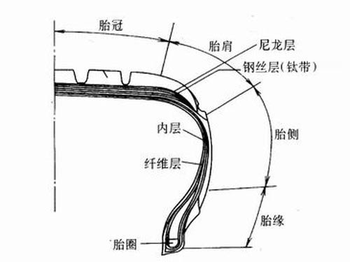 3、 帘布层:帘布层是胎体中由并列挂胶帘子线组成的布层,是轮胎的受力骨架层,用以保证轮胎具有必要的强度及尺寸稳定性。缓冲层为斜交轮胎台面与胎体之间的胶布帘层或胶层,用于缓冲外部的冲击力,保护胎体,增进台面于帘布层之间的粘合。