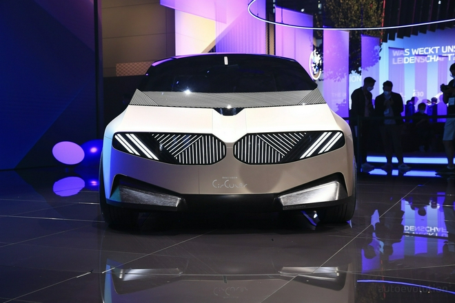 再回归到车辆本身,你几乎完全分辨不出这是一辆宝马车型,设计师们用最简单直接的方式来打造,以往车头的曲线、凸凹统统丢弃,从侧面看车头就是一个平面。经典的双肾造型也抛弃了镀铬、边框等等材料,而是与格栅、头灯等关键部件完全统一。在精简了大量冗余材质后,依靠精准的数字化设计,眼前这辆BMW i循环概念车的确带来一种未来的艺术美感。
