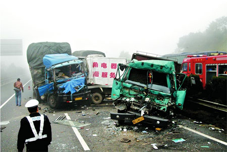 (12月15日上午,大雾天气能见度降低,京珠高速临长段发生多起汽车追尾事故)