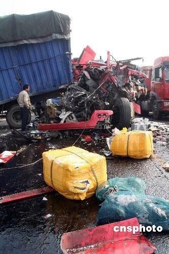 资料图片:2008年11月14日6时30分,由于受团雾影响,沪昆高速江西东乡县195KM--196KM处往南昌方向同时间发生5起汽车追尾事故,造成16辆货车追尾,高速公路交通一度受阻。事故造成5人死亡、10人受伤。 |
