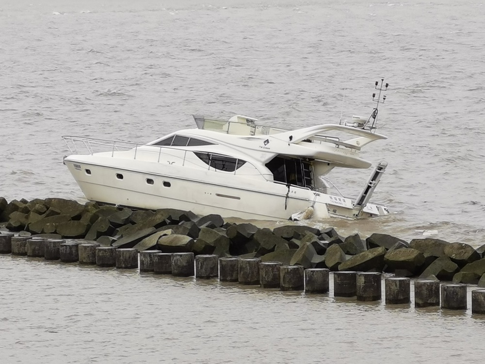 被发现搁浅在崇明区横沙岛北港防汛滩上的游艇。 深夜,游艇俱乐部码头,一艘价值千万的游艇被人偷偷开走,之后被发现搁浅在崇明区横沙岛北港防汛滩上。