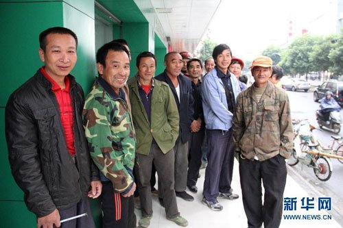 由于下雨,他们挤在一个屋檐底下,他们手中的工具表明了他们是泥工、木工或者电工。他们大多身着褪色的迷彩服或者旧衣服充当的工装,脚蹬早已过时的解放鞋。得知记者来采访,他们都好奇地围了过来,来不及一一记录下他们的名字,记者只能给他们来了张集体照。