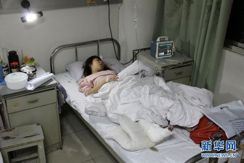 因车祸受伤的女孩巩梦露躺在病床上(10月19日摄)