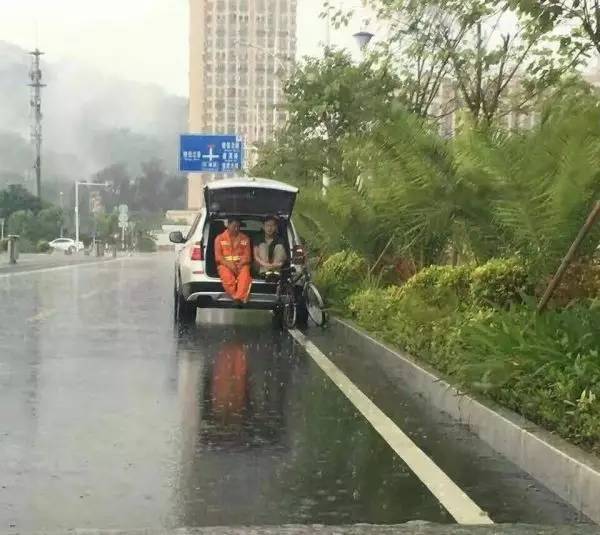 据网友描述,周六突降暴雨,环卫工人无处避雨,一辆车停了下来,车主焦急的对他说:“快上车,我送你回去”。 “不行,我还没有扫完这条路,而且我的单车也放不进去啊!”环卫工人无可奈何地说。 于是,就出现了这一幕,车主打开后尾箱盖,陪着环卫工人一起避雨。 路过的某位驾驶员拍下来这一有爱的照片。 |