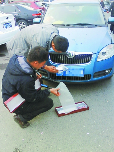 图为工人正在为汽车加装号牌遮盖器。