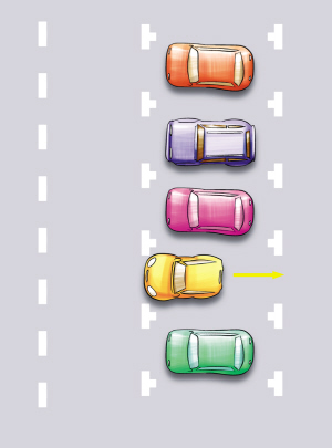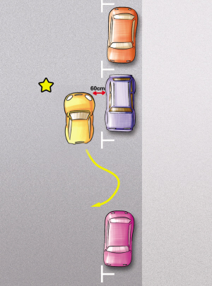 保持自己的车与前车间距60厘米左右并调到平齐位置。