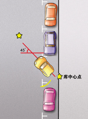 用车尾去找车库的中心点,然后保持约45度角的位置入库。当车尾快碰到马路牙子后,快速反打方向盘,将车头送入车位,最后微调即可。